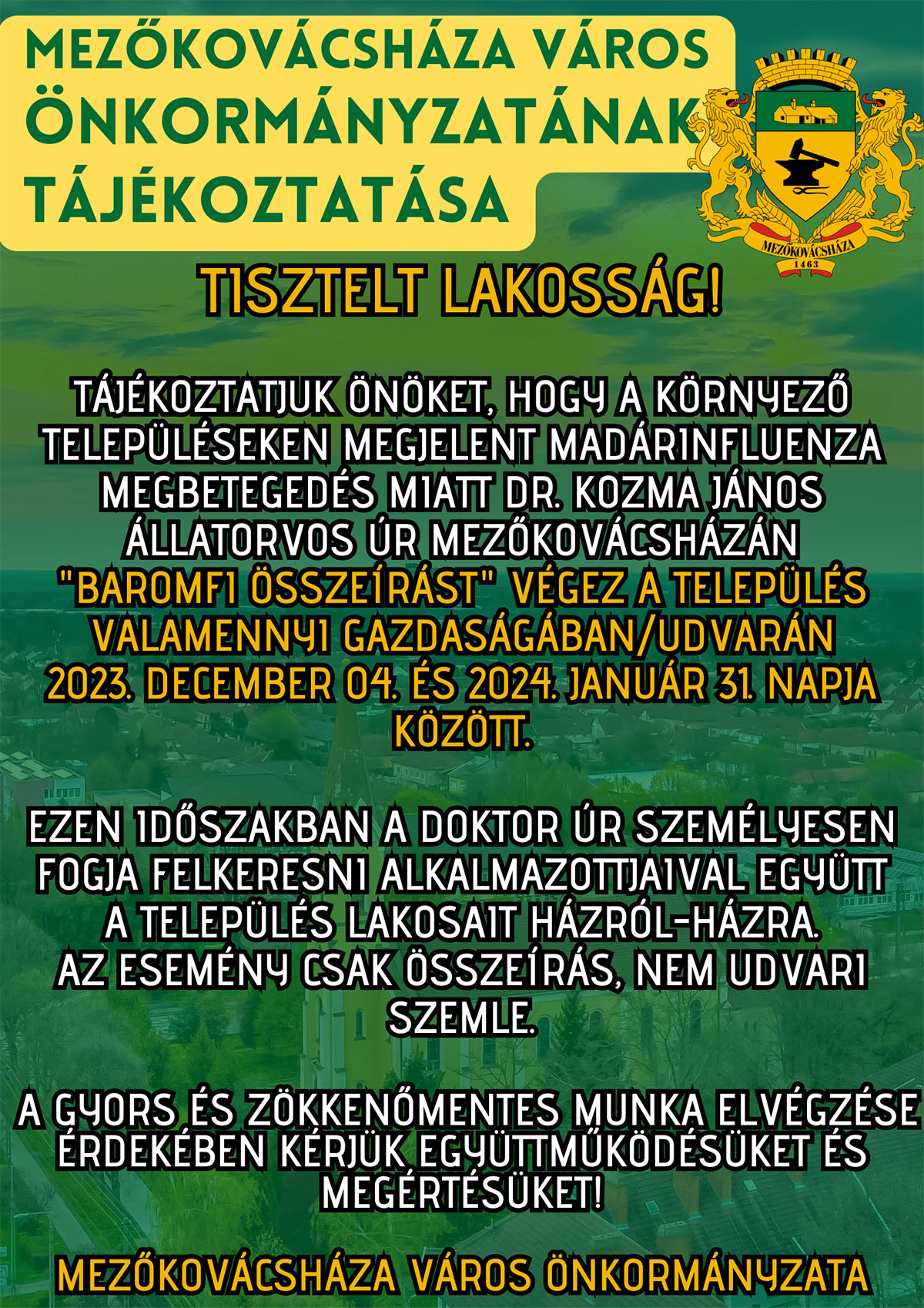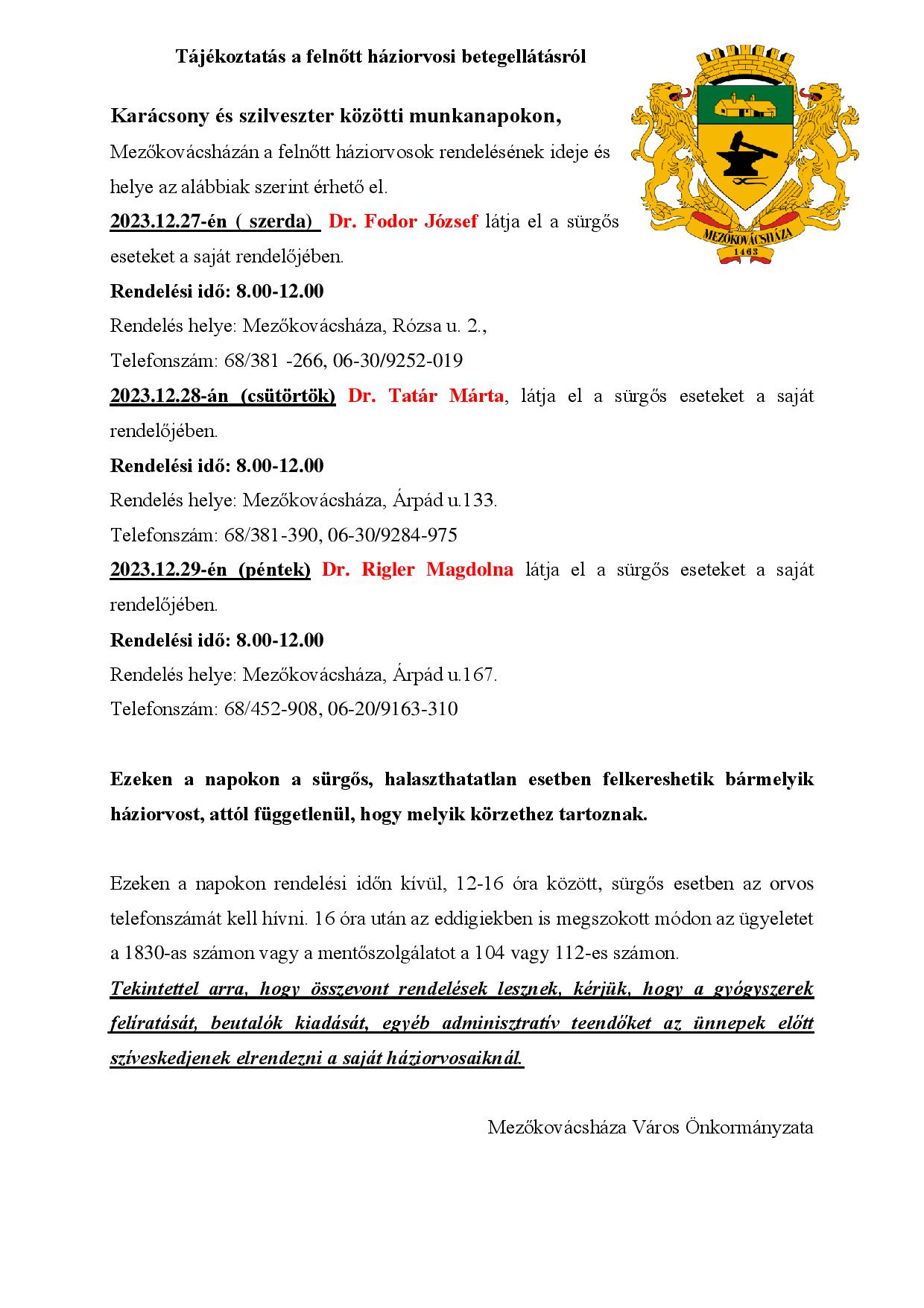 Mezőkovácsháza Község Önkormányzatának Képviselő-testülete 2023. december 14-én (csütörtökön) 13 órai kezdettel közmeghallgatással egybekötött, soros, nyílt ülést tart, melyre ezúton meghívom.