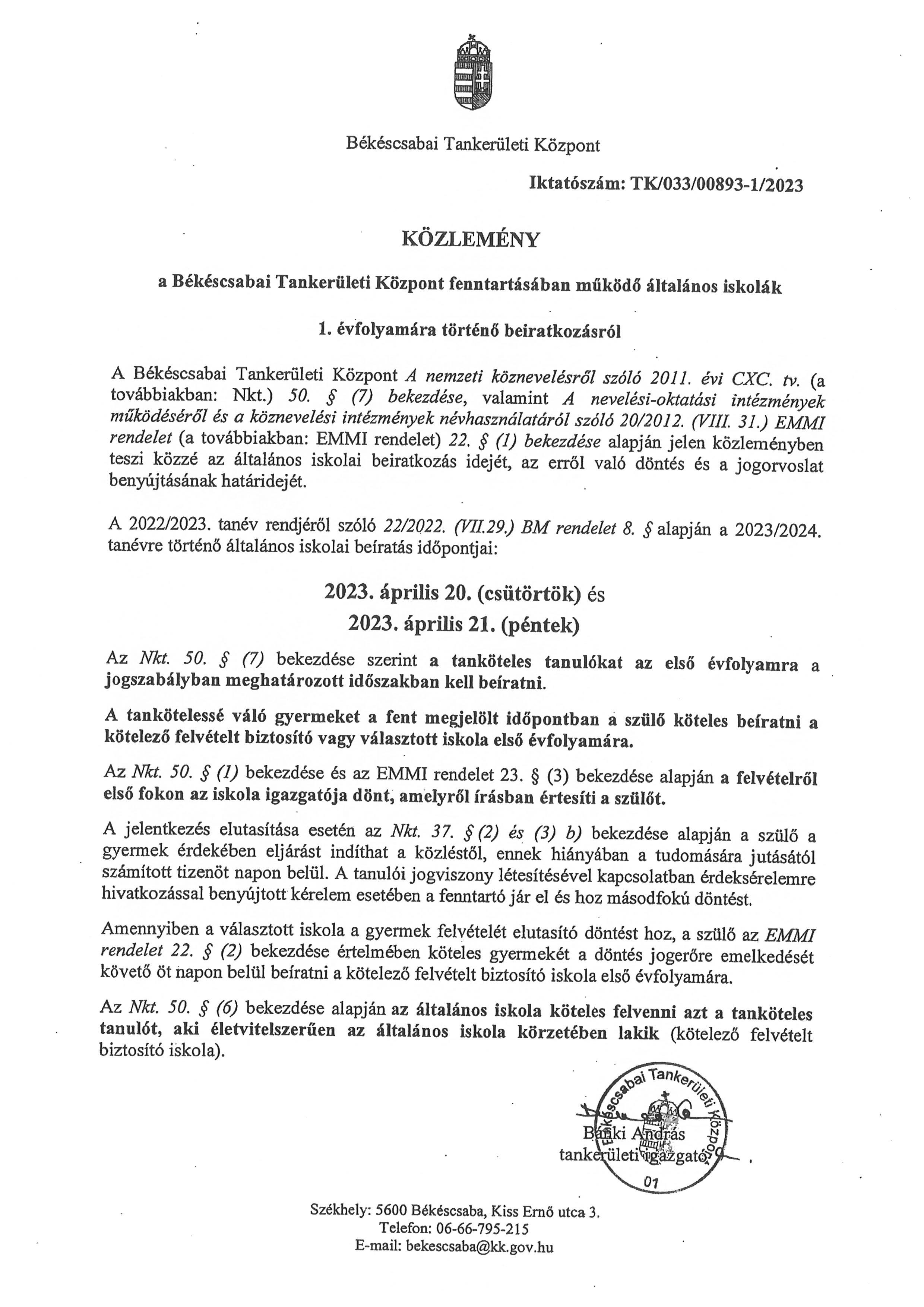 Az óvoda vezetője az óvodai felvételi, átvételi kérelemnek helyt adó döntését írásban, a kérelem elutasítására vonatkozó döntését határozati formában közli a szülővel. Az óvodai felvétel tárgyában meghozott döntés közlésének határnapja: 2023. május 30.